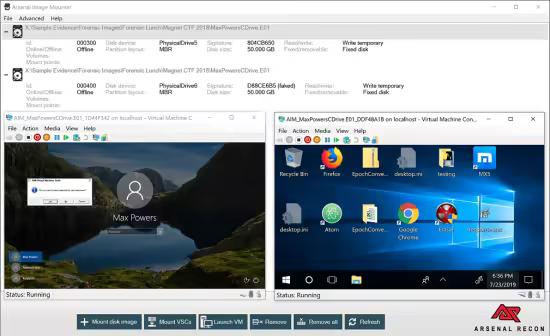 Arsenal Image Mounter mounts the contents of disk images as complete disks in Windows®. As far as Windows is concerned, the contents of disk images mounted by Arsenal Image Mounter are real SCSI disks, allowing users to benefit from disk-specific features like integration with Disk Manager, launching virtual machines (and then bypassing Windows authentication), managing BitLocker-protected volumes, mounting Volume Shadow Copies, and more.