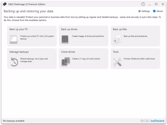 The unique fortress mode of O&O DiskImage 22 Premium allows the application to run in a completely isolated and secured Windows environment, so that backups can be performed without the influence of other applications. Direct forensic backups are also possible, which freeze the current state of all memory sectors of the system and map it exactly.